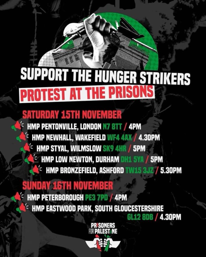 Am Samstag, dem 15. November, wurde in London ein Transparent von der Westminster Bridge aus entrollt, auf dem zu lesen war: „Wir unterstützen die Hungerstreikenden. […]