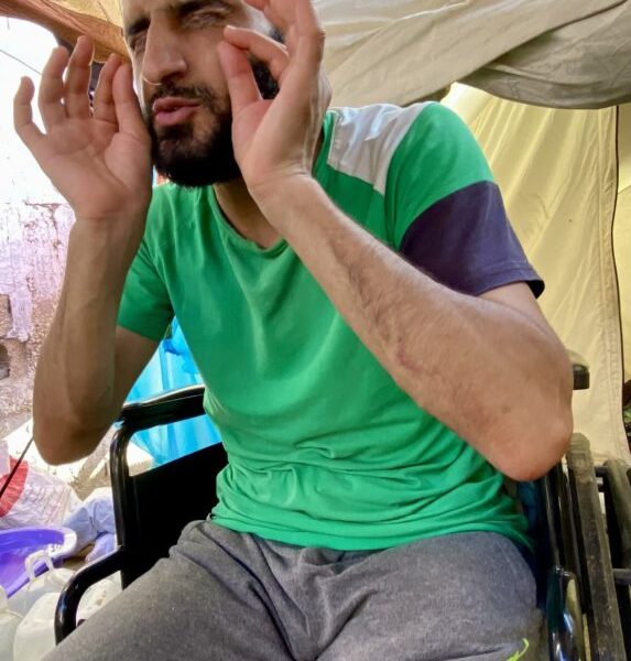 Vor zwölf Jahren verlor Mahmoud Saïd Abu Foul bei einem israelischen Bombenangriff auf das Lager Jabalia ein Bein. Zusammen mit mehr als 200 Pflegekräften und Vertriebenen, die im Kamal-Adwan-Krankenhaus in Gaza Zuflucht gesucht hatten, wurde er am 27. Dezember 2024 festgenommen. Im Rahmen des Waffenstillstandsabkommens wurde er freigelassen. Während seiner zehnmonatigen Haft im israelischen Gefängnis Sde Teiman wurde er, wie Hunderte andere Gefangene, denen er begegnete, schwer gefoltert. Insbesondere verlor er sein Augenlicht, nachdem ein israelischer Soldat ihn anderthalb Monate nach seiner Verhaftung mit einem Metallstuhl heftig auf den Kopf geschlagen hatte. „Ich sah einen weißen Blitz, bevor alles schwarz wurde. Seitdem habe ich kein Licht mehr gesehen“, erzählt er. Er erklärt, dass seine Augenlider anschließend verklebt waren, Blut und Tränen flossen und ein übelriechender Geruch entstand. Da er keine angemessene Behandlung erhielt, verlor er sein Augenlicht und leidet unter ständigen Schmerzen in den Augen und im Kopf. Mahmoud lebt mit seiner vertriebenen Familie in einem Zelt in Az-Zawaida, nachdem ihr Haus in Beit Lahia zerstört wurde.