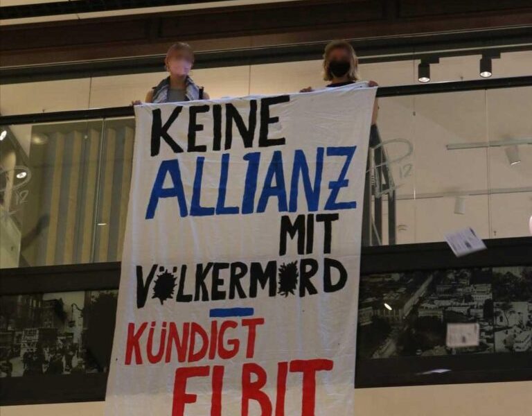 Außerdem wurde in der »Mall of Berlin« ein Bannerdrop gemacht und Flyer von oben abgeworfen, die direkt die Menschen im Erdgeschoss erreichten. Eine kreative und eindrucksvolle Protestaktion gegen die Profite aus Krieg und Völkermord.” (@abdallahxbln – Instagram)