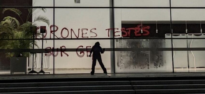 Am 15. Oktober fand in Bordeaux eine Messe namens „UAV Show” statt, die europäische Drohnenmesse. Um gegen den Einsatz von Drohnen während des Völkermords in Gaza zu protestieren, wurden vor den Eingängen Nägel verstreut, rote Farbe verschüttet und Graffitis mit der Aufschrift „Free Palestine” an die Fassade des Kongresszentrums gesprüht. Drohnen erleichtern dem Militär das Töten von Menschenmassen. Leben auslöschen, ohne zu kämpfen, sehen, ohne gesehen zu werden, zuschlagen, ohne Risiko, geschützt in einem Operationszentrum fernab der Front. Mittlerweile ermöglichen sie überall das Töten aus der Ferne, mit Präzision und extremer Sicherheit. Drohnen bringen den höchsten Grad an technologischer Barbarei in den modernen Krieg.