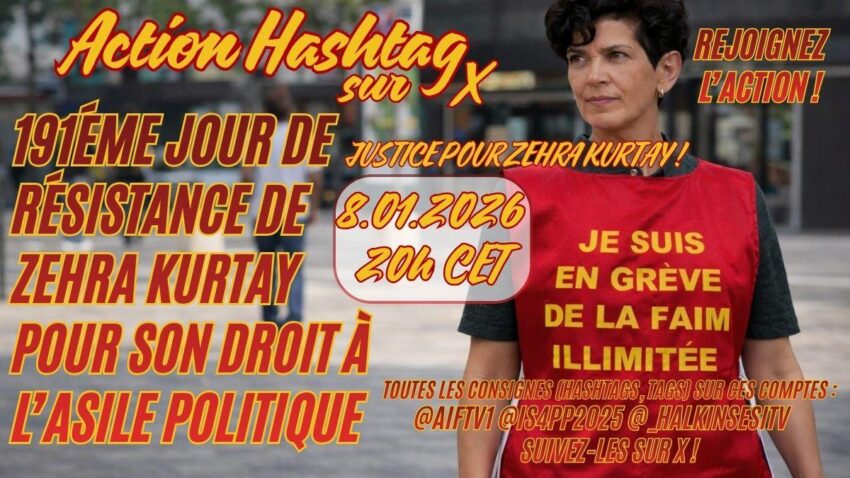 Die revolutionäre Aktivistin Zehra Kurtay befindet sich seit dem 3. Juli 2025 im Hungerstreik, um ihre Aufenthaltsgenehmigung in Frankreich wiederzuerlangen (siehe unseren Artikel). Ihre administrative Situation wird am 12. Januar im Rahmen ihres dritten Prozesses gegen die Präfektur, die gegen zwei vorherige positive Urteile Berufung eingelegt hat, erneut geprüft. In dieser Verhandlung soll über ihre Aufenthaltsgenehmigung entschieden werden, die in Frankreich von der Präfektur für unterschiedliche Zeiträume ausgestellt wird, aber die offizielle Anerkennung als Flüchtling und der Schutz vor Abschiebung werden erst nach einer Entscheidung der Ofpra gewährt. Das Verfahren wurde seit dem 15. Dezember verzögert, und ihr zweiter Antrag bei der Ofpra wurde abgelehnt. Anwälte und Verbände fordern die Behörden und die Justiz auf, das Verfahren angesichts der Dringlichkeit ihrer medizinischen Situation zu beschleunigen, und organisieren dazu am 8. Januar um 11 Uhr eine Kundgebung vor der OFPRA (201 rue Carnot, Bâtiment A, Fontenay-sous-Bois) und eine weitere vor dem Verwaltungsberufungsgericht von Paris am 12. Januar um 10 Uhr (86 rue François Miron) organisiert. Gleichzeitig wird zu einem Twitterstorm auf X am 8. Januar um 20 Uhr aufgerufen (siehe Foto).