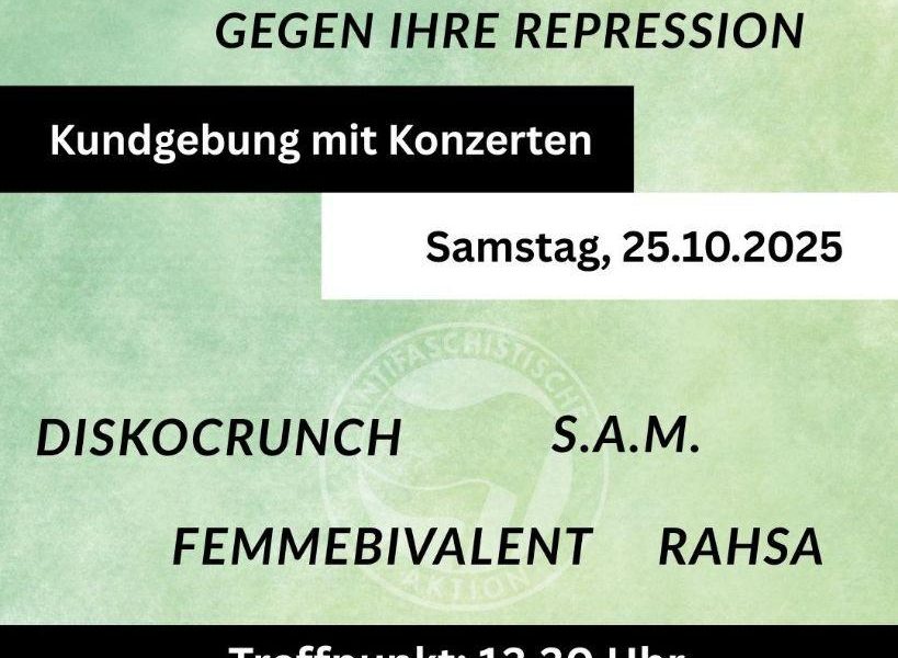 Wir haben Clara und alle anderen Gefangenen nicht vergessen! Deshalb wollen wir am 25.10. mit Euch gemeinsam zum Knast ziehen und unserer Solidarität mit einem Konzert mit Diskocrunch, Femmebivalent, Rahsa und S.A.M. vor Ort Ausdruck verleihen! Wie üblich wollen wir außerdem ein paar ermutigende Worte mit Family and Friends über die Mauern senden.