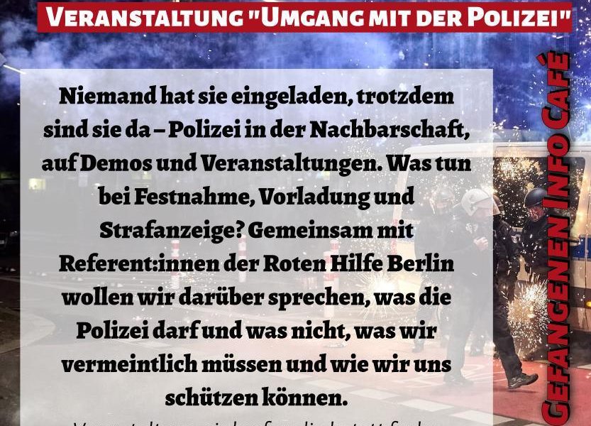 Ab 19 Uhr Veranstaltung zum Thema „Umgang mit der Polizei“. Niemand hat sie eingeladen, trotzdem sind sie da – Polizei in der Nachbarschaft, auf Demos und Veranstaltungen. Was tun bei Festnahme, Vorladung und Strafanzeige? Gemeinsam mit Referent:innen der Roten Hilfe Berlin wollen wir darüber sprechen, was die Polizei darf und was nicht, was wir vermeintlich müssen und wie wir uns schützen können.