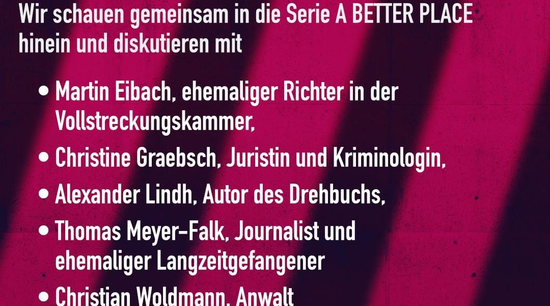 Die ARD-Mini-Serie A Better Place geht genau diesen Fragen nach: In einer fiktiven Stadt werden alle Gefängnisse abgeschafft, die Gefangenen werden entlassen. Wir wollen einen Ausschnitt aus der Serie gemeinsam anschauen und im Anschluss mit Expert:innen diskutieren, wie realistisch die Perspektive ist, die A Better Place zeichnet.