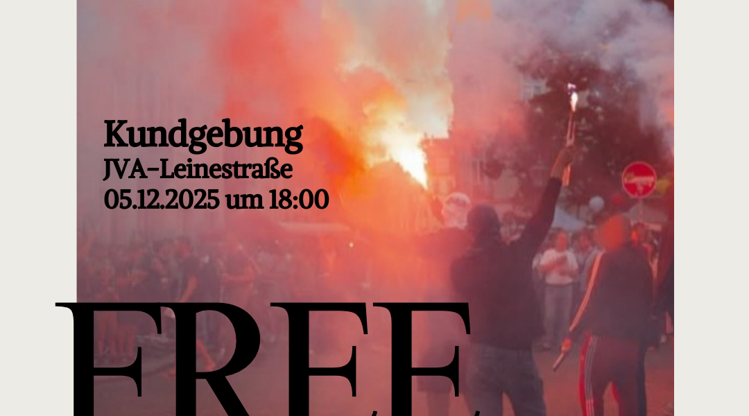 Kundgebung an der JVA-Leinestraße am 05.12.2025 um 18:00 Seit über 10 Monaten sitzt unser Freund Paul nun in der JVA Leinestraße in Untersuchungshaft. Am 25.11. startete nun der Prozess gegen ihn und sechs weitere Antifaschisten und Antifaschistinnen in Dresden.