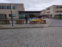 Am Tag als Domhöver nun im zweiten „Antifa-Ost-Verfahren“ weiter vernommen werden sollte, stehen zwei Nazis vor dem Gerichtsgebäude und halten ein Plakat mit „Antifa nach Guantanamo“ vor der Brust. Sie hatten die Kundgebung brav angemeldet. Nach ihrer „Kundgebung“, zu der sie selbst nicht mehr als zwei Personen erwartet hatten, saßen sie einige Stunden mit im Gerichtssaal, in Gesellschaft mit dem Neonazi Robin Schmiemann, einem Combat-18-Aktivisten und Brieffreund von Beate Zschäpe, der gemeinsam mit der Szeneanwältin Nicole Schneiders, im PKW zur Prozessbeobachtung anreiste.
