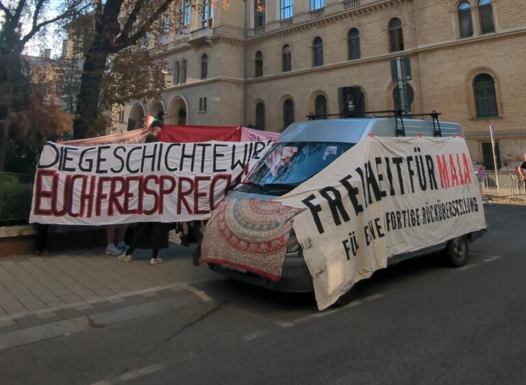 Beim heutigen Prozesstag gegen Maja T. in Budapest am 29.09.2025 untersagten die ungarischen Behörden den Teilnehmenden an einer antifaschistischen Demonstration vor dem Gerichtsgebäude die Nutzung der Musikanlage. Laut den zuständigen Polizeibeamt:innen gingen sie diesen beispiellosen Schritt aufgrund einer offiziellen Stellungnahme des Gerichts, die die Musikanlage als Störfaktor für die Arbeit des Gerichts darstellte. Dies stellt einen massiven Eingriff in die freie Meinungsäußerung dar und unterbindet diese fast gänzlich. Dies ist ein entscheidender Eingriff in das EU-weit gültige Recht auf Meinungsfreiheit und Versammlung, das nicht ohne Konsequenzen bleiben darf.