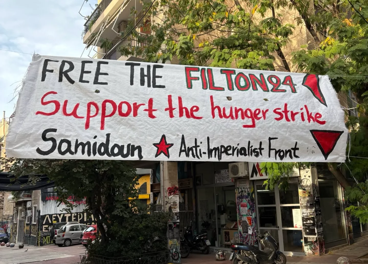 Solidarität mit politischen Gefangenen in der Türkei, Großbritannien und PalästinaAthen: Heute hat die Antiimperialistische Front in Griechenland gemeinsam mit dem Samidoun Palestinian Prisoners Solidarity Network Transparente vorbereitet und aufgehängt, um ihre Solidarität mit politischen Gefangenen zu bekunden, die in Gefängnissen im Hungerstreik sind.
