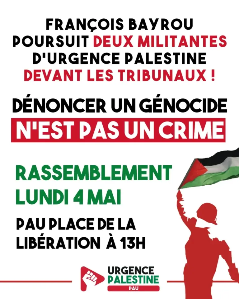 Am 4. Mai werden zwei Aktivistinnen der Gruppe Urgence Palestine Pau aufgrund einer Klage von François Bayrou wegen Verleumdung vor Gericht stehen. Ihnen wird vorgeworfen, […]