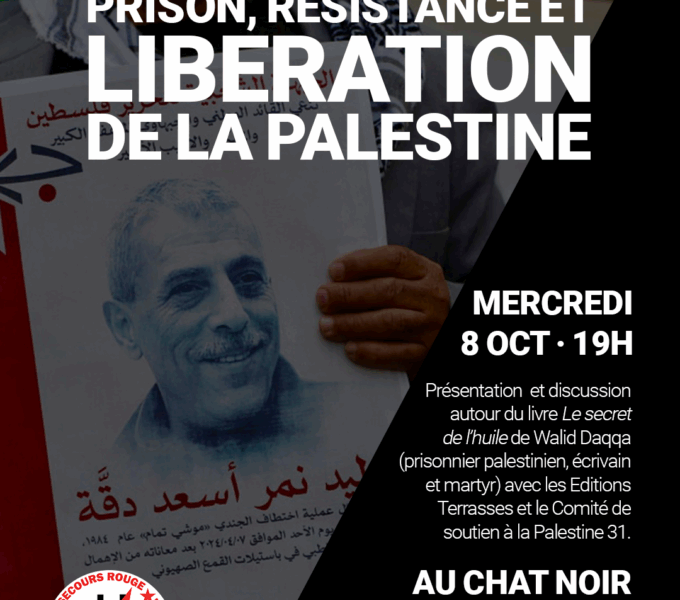 In diesem Buch, das sich zwischen Jugendliteratur und philosophischer Reflexion bewegt, erzählt der politische Gefangene, Kämpfer der palästinensischen Linken und Schriftsteller Walid Daqqa eine Geschichte über das Gefängnis, den Widerstand und die Befreiung Palästinas. Es ist ein Echo seines eigenen Lebens, denn er verbrachte mehr als 38 Jahre in israelischen Gefängnissen, wo er seinen Kampf unermüdlich fortsetzte und sich dem Konzentrationslagersystem widersetzte, bis er eine Erlaubnis erhielt, obwohl dies verboten war. Dieses Buch erzählt die Geschichte eines kleinen Kindes, das trotz des Besuchsverbots im Gefängnis darum kämpft, seinen Vater sehen zu dürfen. Diese Präsentation bietet die Gelegenheit, über die zentrale Bedeutung der Gefangenen im palästinensischen Kampf zu diskutieren. Und auch über die Gefängnisliteratur als eines der Mittel des Widerstands eines ganzen Volkes gegen den Siedlungskolonialismus und den andauernden Völkermord. Am Mittwoch, den 8. Oktober um 19 Uhr im Chat Noir veranstaltet Secours Rouge Toulouse seinen zweiten monatlichen Abend Faisons Front zum Thema „Gefängnis, Widerstand und Befreiung Palästinas” mit den Éditions Terrasses und dem Comité de soutien à la Palestine 31.