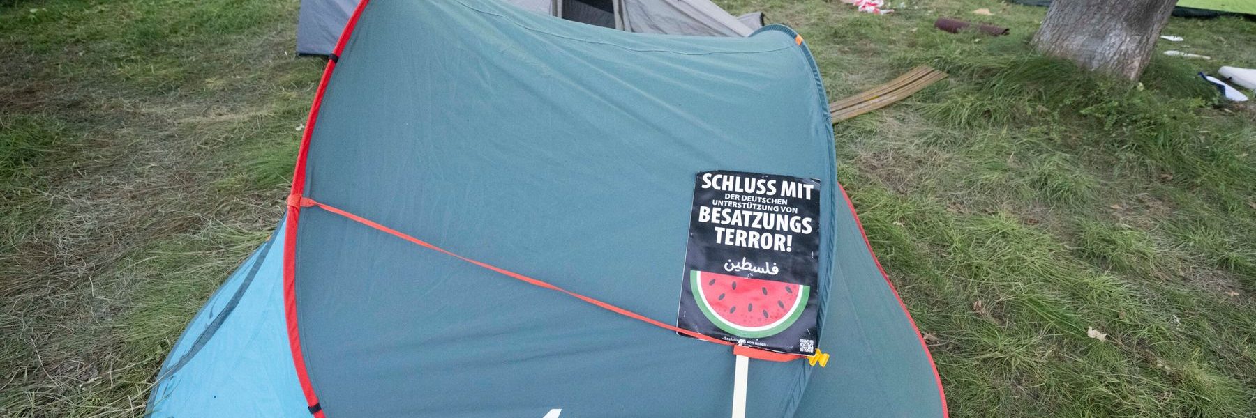 Nach der Attacke auf den israelischen Rüstungskonzern Elbit gab es vor dem Firmensitz in Ulm ein weiteres Protestcamp. dpa/Marijan Murat