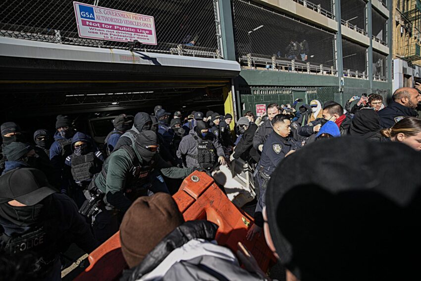 Als die ICE-Beamten die Garagentür öffneten, um die Lage zu beurteilen, begann die Menge „ICE raus aus New York” zu skandieren. Hinter den ersten Reihen der Menge tauchten erste einfache Barrikaden auf. Die Stadtpolizei (NYPD) begann, sich zwischen die ICE-Beamten und die Menschenmenge zu stellen, die Blockadematerial (Mülltonnen, Paletten usw.) sammelte. Die ICE-Beamten saßen von 10 Uhr bis zum frühen Nachmittag in der Garage fest. In der Zwischenzeit nahm die NYPD mehrere Personen fest und stellte Absperrgitter auf. Als die Autos endlich aus der Garage fuhren, rannten mehrere mutige Menschen vor den Konvoi, um ihn aufzuhalten. Dadurch wurde er so weit verlangsamt, dass andere Menschen Gegenstände auf die Straße legen konnten. Der Konvoi, der von der Bereitschaftspolizei der NYPD geschützt wurde, konnte sich aufgrund der Hindernisse und der Wurfgeschosse nur schwer aus der Umklammerung befreien. Schließlich kehrte die Hälfte des Konvois in die Garage zurück, während die andere Hälfte New York verließ und sich in Richtung Jersey City bewegte. Nach Ende der Aktion überwachten Gemeindegruppen weiterhin das Viertel um die Canal Street, für den Fall, dass die ICE versuchen sollte, zurückzukehren, und Anti-ICE-Gruppen patrouillierten den Rest des Tages und den nächsten Tag. Die NYPD nahm im Laufe des Tages etwa zehn Personen fest und beschuldigte zwei von ihnen der Gewalt gegen Polizeibeamte. Weitere Details finden Sie hier.